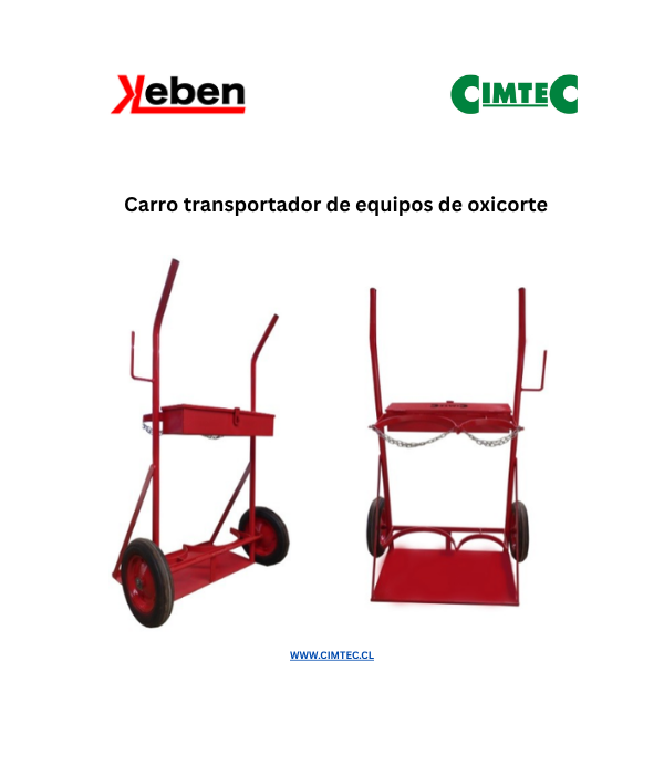 Carro metálicos con ruedas macizas de goma de alta resistencia para traslado de cilindros de gases para actividades de corte por equipos de oxiflama. Posee caja para resguardo de herramientas y cadena de seguridad para fijación de cilindros.