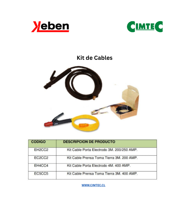 El kit de cables esta conformado por un cable porta electrodo y prensa de toma a tierra en presentaciones de 3 y 4 metros de largo con capacidades de 200A y 400A
